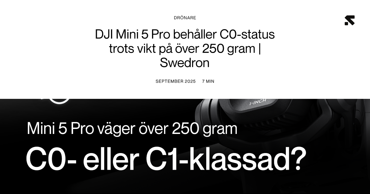 Med andra ord: du behöver inget drönarkort som hobbyflygare i A1, även om din Mini 5 Pro råkar väga in på 252 g. Det viktiga är att flyga den i originalkonfiguration - monterar man t.ex. propellerskydd som gör att vikten går upp rejält, då gäller inte C0-klassningen längre.